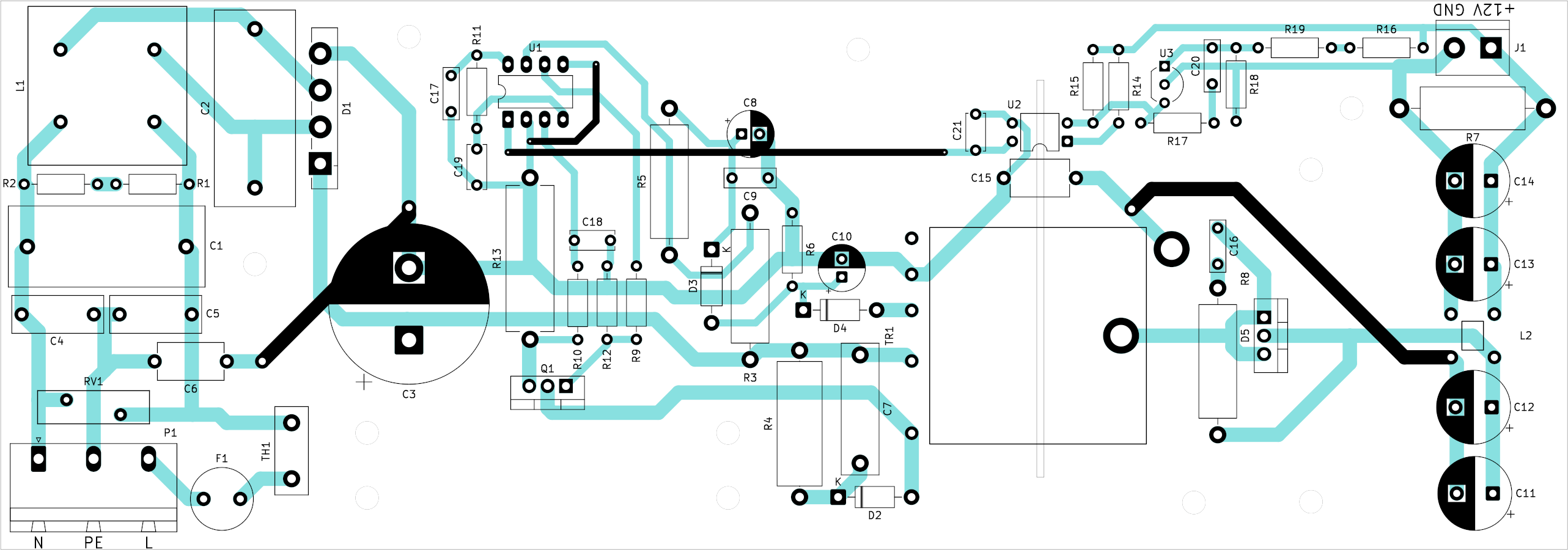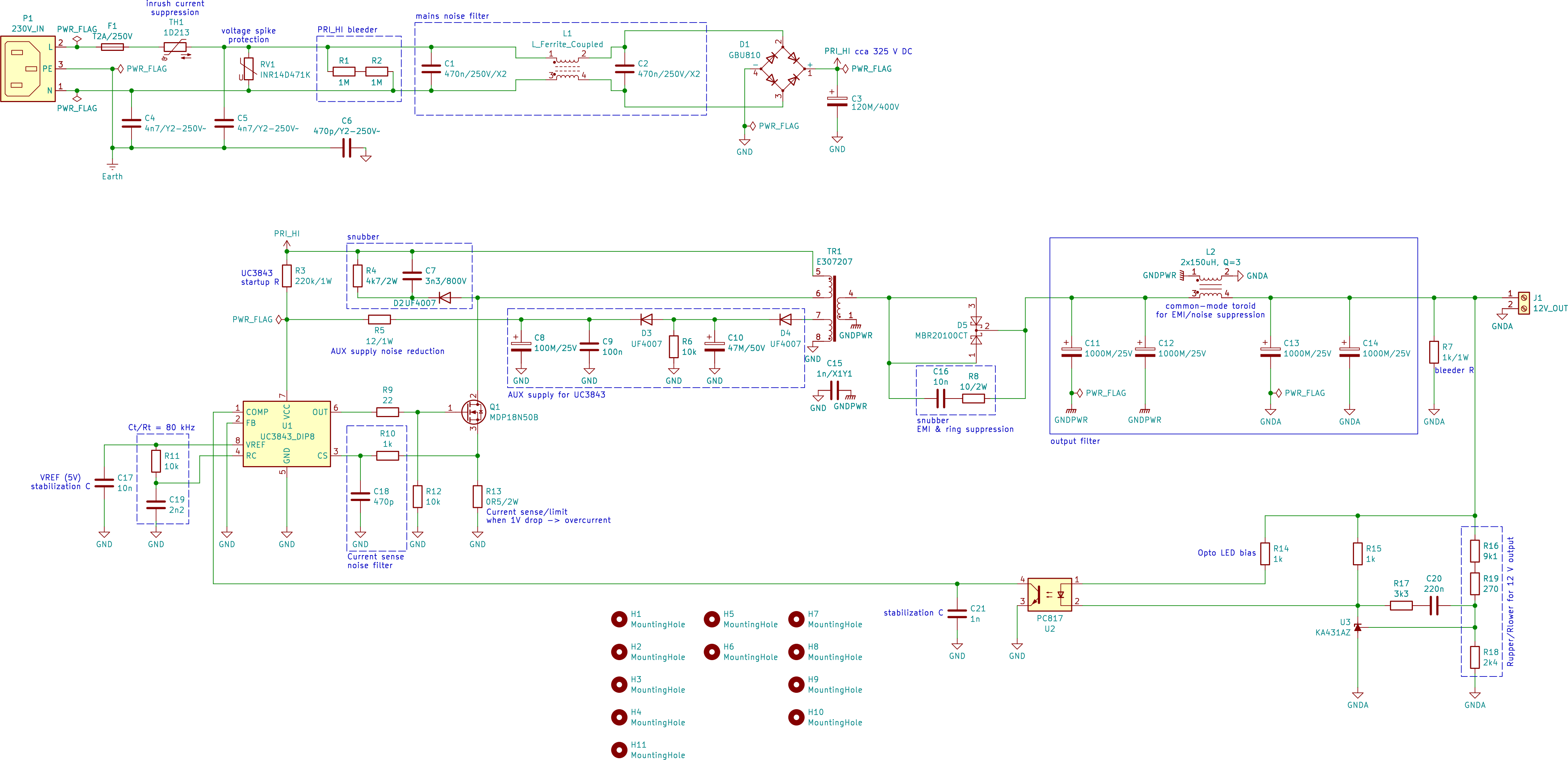Kondenzátor C15 je zapojený medzi primárnu a sekundárnu zem, údajne dobrá praktika. Bol aj v pôvodnom zrecyklovanom zapojení, tak som ho zachoval. Zvyčajne máva hodnotu od 1 nF do 4n7 a musí mať špeciálne bezpečnostné parametre na zachovanie izolačnej pevnosti medzi primárnou a sekundárnou stranou. Na zlepšenie izolácie je tiež na plošnom spoji vyrezaná vzduchová medzera.