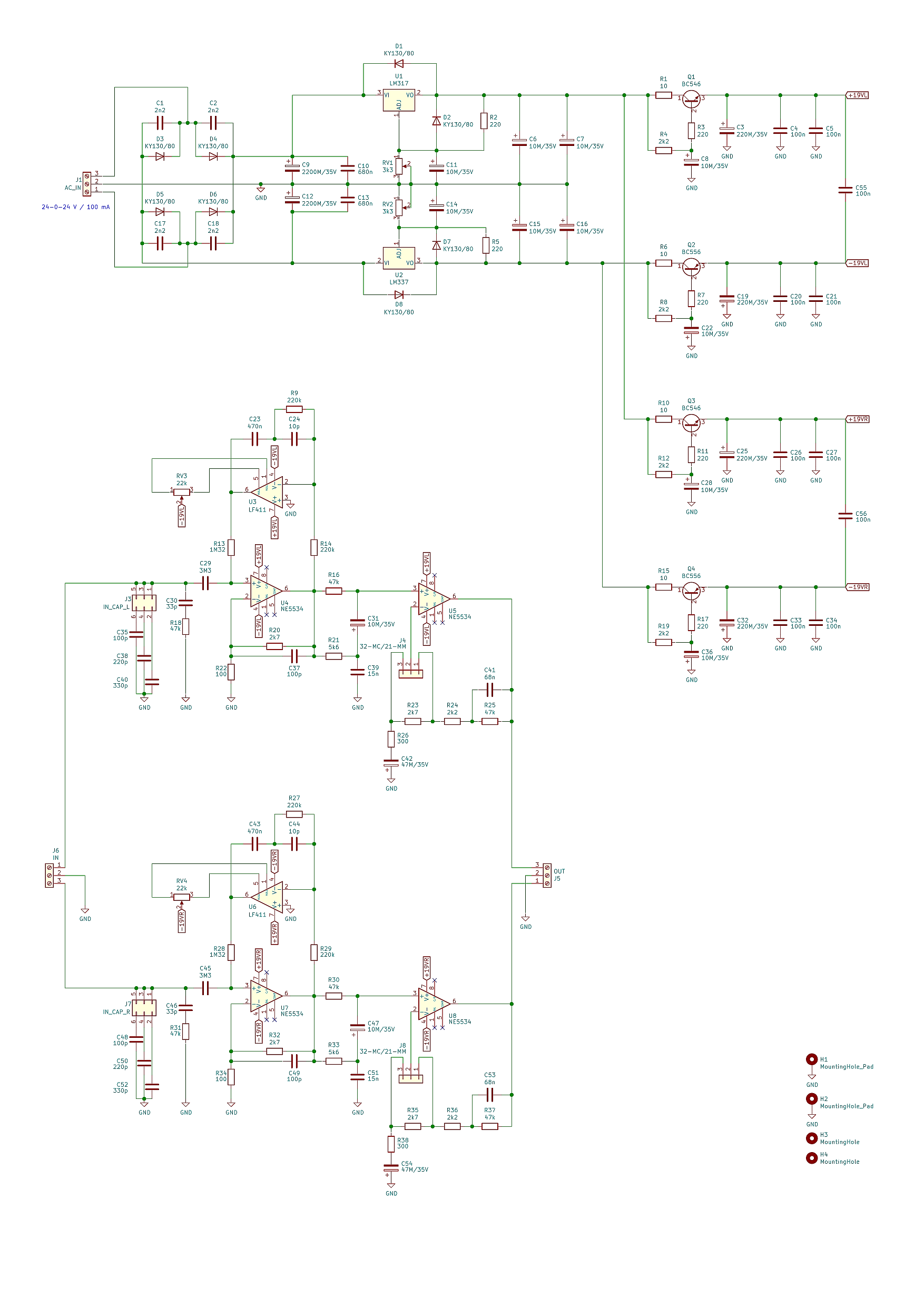 Tak som použil jedno osvedčené zapojenie, ktoré som našiel a ktoré obsahovalo chyby, tak som ich opravil. K tomu som ešte použil namiesto pevných rezistorov pri LM317 a LM337 potenciometre, aby sa dalo nastaviť napájacie napätie úplne presne a tak, aby bolo čo najdokonalejšie symetrické. Ďalej som pri LM317 a LM337 použil všetky odporúčané súčiastky z datasheetu, aby som ich zapojenie čo najviac zlepšil. A nakoniec som zamenil diódový mostík za jednotlivé diódy. Mostíkov je totiž veľmi veľa rôznych typov a je zbytočné sa tu viazať na jeden konkrétny typ, ak má byť zapojenie čo najuniverzálnejšie. Oproti tomu diód má doma každý dosť. Možno použiť akékoľvek diódy, ktoré znesú v závernom smere aspoň nejakých 50 V, ja som použil staré Teslácke KY130/80, ktorých mám plno.